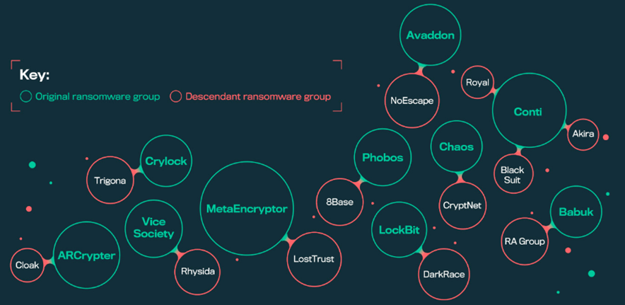 WithSecure社が発表したリサーチによれば、近年グループ内での対立によってメンバーが離脱し、攻撃用のソースコードを流用して新たなグループを立ち上げているような状況もあり、その結果攻撃グループが増加し続けているようです。以下の図の緑の円がオリジナル(元の)ランサムウェア攻撃グループであり、赤い円がそこから派生したグループを表しています。