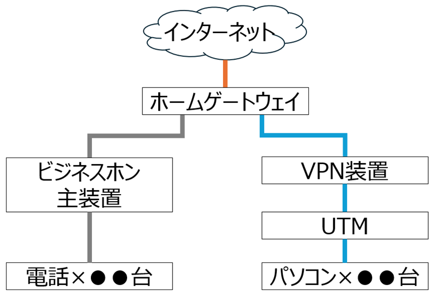 ①ビジネスホン主装置は、ホームゲートウェイではなく電柱から企業側へ引き込まれた電話線と接続されている。