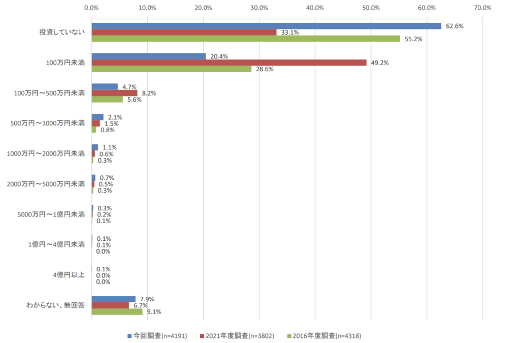 さらに情報セキュリティ対策のデータでも、「投資していない」企業が全体の62.6%でトップとなり、次に「1百万円未満」が20.4%と相当数存在しています。これに対し、「1百万円から5百万円未満」と回答した企業はわずか4.7%に留まっています。