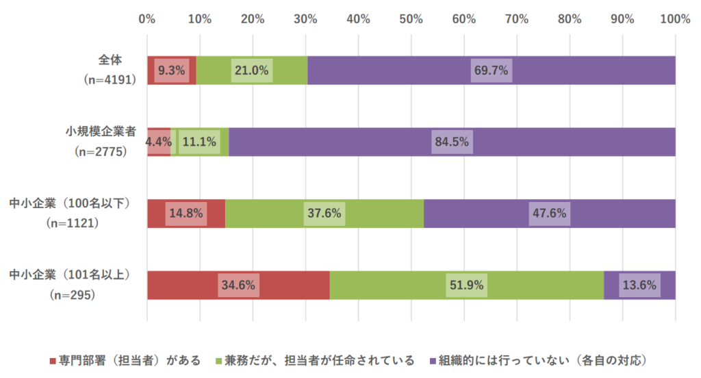 つまり、100人以下の中小企業の約半数は「組織的に行っておらず各自の対応に任せている」状況です。