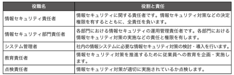 また、小規模な企業においては、表1の例に忠実である必要はなく、組織の規模や事情に応じた現実的な体制(役割分担)を独自に設計することも大切です。