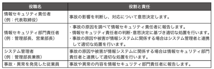 事業や顧客に重大な影響を及ぼすインシデントが発生した際、速やかに適切な対応を取るためには、事前に明確な体制を決めておくことが不可欠です(表2)。