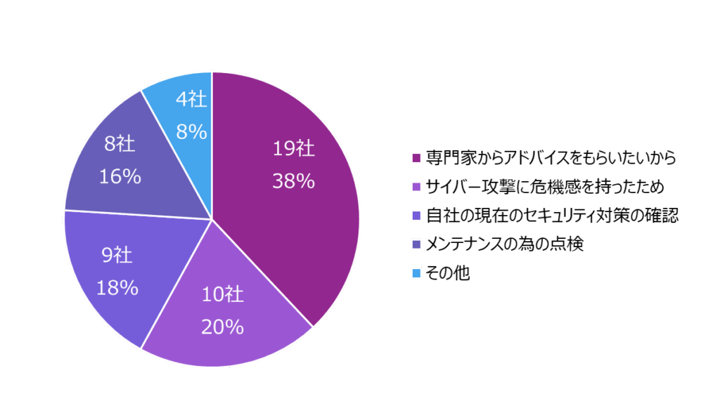 各企業の参加目的として最も多かったのは「専門家からアドバイスをもらいたいから」、ついで「サイバー攻撃に危機感を持ったため」に。