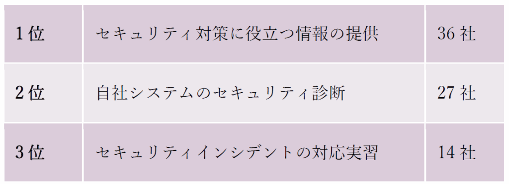 情報提供のニーズは高く、回答の約8割を占め、次いでセキュリティ診断が約6割を占めています。