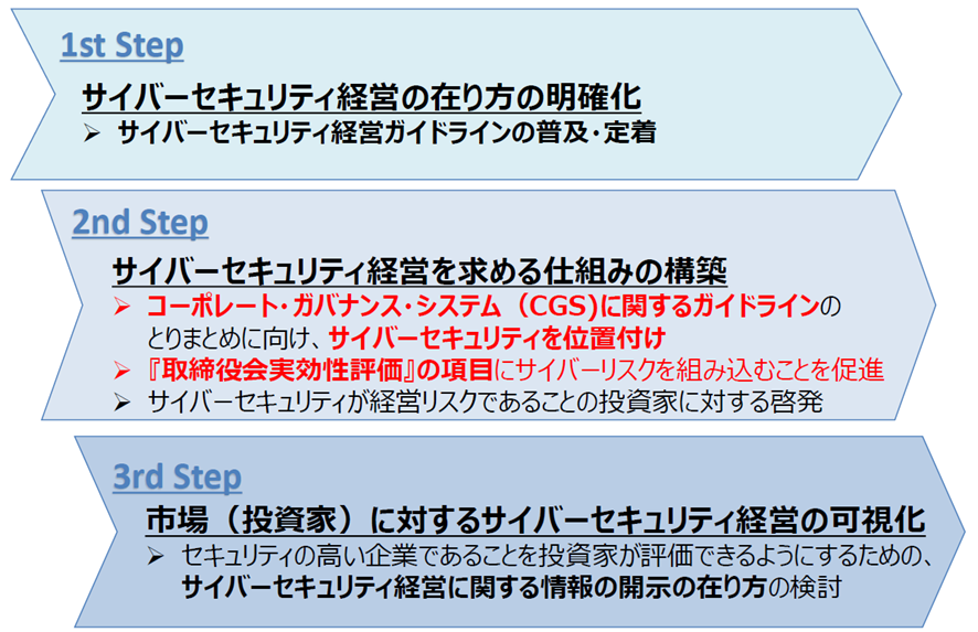 そして、①の経営者向けの施策を推進するために策定されたのが、今回のテーマである「サイバーセキュリティ経営ガイドライン」なのです。なお、経済産業省では①の実現に向け、図に示す3つのStepで進めてきました。
