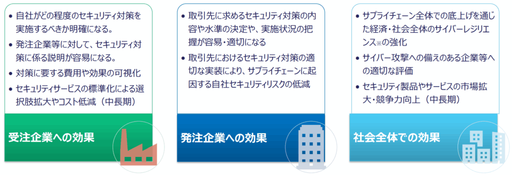図にあるように、本制度により、発注者・受注者双方にとって、適切なセキュリティ対策の決定や対策状況の説明が容易となるほか、取引先のセキュリティ対策が適切に実装されることで、発注企業のサプライチェーンリスクの低減、経済・社会全体でのサイバーレジリエンス※の強化等が期待されます。